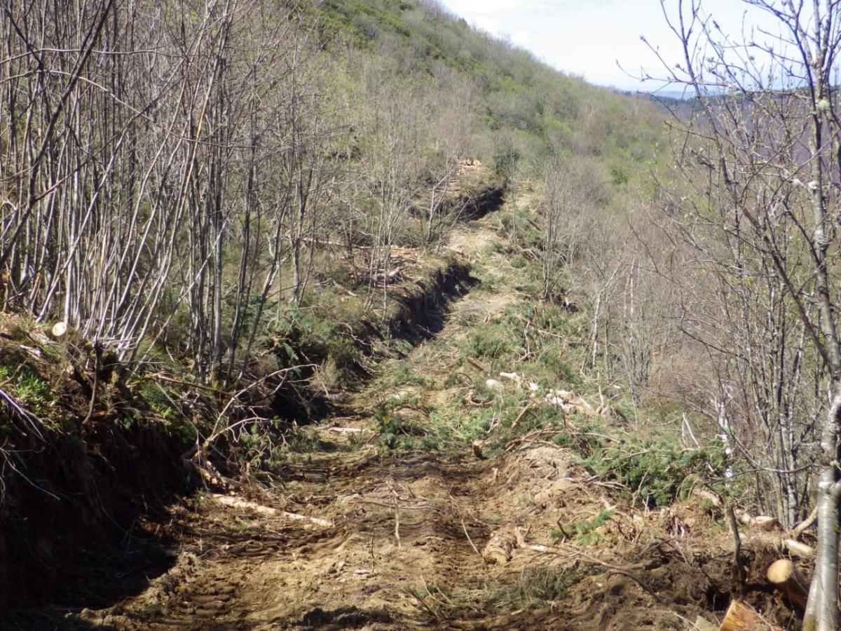 The silviculture work to remove an old single-species plantation of Pinus sylvestris of 15 ha in the MVMC of Riocereixa (Pedrafita do Cebreiro, Lugo) went on from September 2018 to May 2019 —when the whole process was completed. The high vulnerability of the Natura 2000 area (ZEC Os Ancares – O Courel ES1120001) where work was done, its rugged orography and the existing harsh weather conditions (snowfalls with >3 week frequency, from October 2018 to April 2019) caused the delay. Therefore, once all the relevant approvals were obtained and before actions started, several visits were made, along with the crew in charge of pine grove felling, to give details about methods, action strategies, ways to avoid impacts and to draw the right plan for the development of works. Once all matters were clarified, manual felling operations started. To do so, operators used chainsaws and the necessary personal protective equipment (PPE) for their safety. For felling operations, the friendliest felling trails for the naturally-regenerated species (Sorbus aucuparia, Betula pubescens, etc.) that are characteristic of the habitat 9580* were chosen. These species work as the basis on which the characteristic lush canopy will be re-established and they will be complementary to the restoration taking place later on.